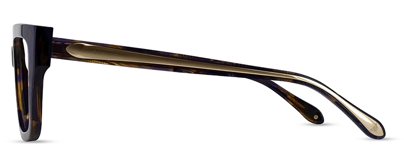 - Elegantly sculpted metallic hardware is inlaid into the temple